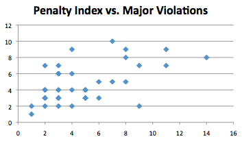 Sorry for the ugly chart, but I’ve been in a bit of a rush. Â The x-axis is “Number of Major Violations” and the y-axis is “Penalty Index” as defined above. Â So much for the penalty index. Â Maybe the COI’s rationale correlates at a lower level, so let’s give that a try.